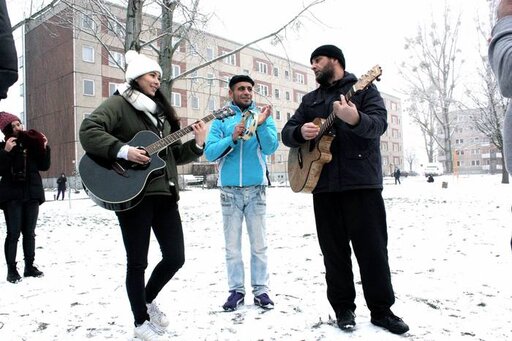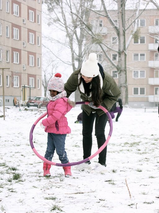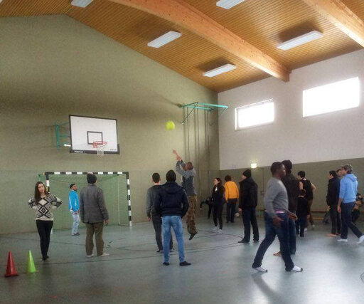 Abdi who speaks Somali language, Israa and Noor who speak Arabic, Hania and Holger whom people recognize and seem to like and trust, India who came for the first time and was full of enthusiasm… Door by door we kept knocking, personally inviting people to join us outside and later do sport, music and art in the local sport hall – the place that we would never could get (and never for as long as four hours) without help from Hilde and Horst Nies, amazing activists from the local Willkomenskreis.