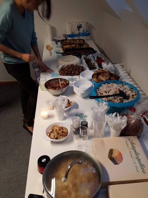 More and more people started arriving and by 5pm there were around 40 people celebrating Christmas together – many people had prepared dishes at home and brought them to share with us and we had a real Christmas feast laid out on the table.