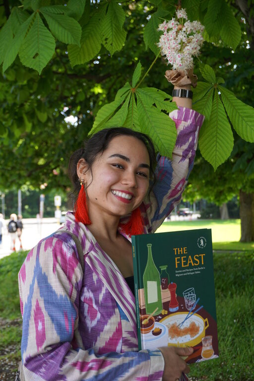 An einem Open Kitchen-Mittwoch übernahm sie sogar die Rolle der Chefköchin und kochte gemeinsam mit anderen Teilnehmer*innen usbekische Gerichte. „Es war amüsant zu sehen, wie Rezepte, mit denen ich aufgewachsen bin, völlig unterschiedlich interpretiert wurden“, lacht sie und erinnert sich daran, wie einige Teilnehmer mit der Anweisung kämpften, Gurken in dünne Scheiben zu schneiden, und stattdessen Kreise, Scheiben oder Würfel erhielten.