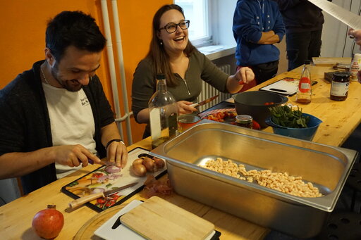Heute wollten sie Mutabal, Muhammara, Hummus und einen griechischen Salat zubereiten. Sie hatten mit 30 Teilnehmern gerechnet, aber am Ende waren mehr als doppelt so viele gekommen. Die Türklingel hatte nicht aufgehört zu läuten, und Wellen von Menschen waren in die kleine Küche und einen angrenzenden Raum geströmt, um gemeinsam das Essen zuzubereiten. Die Neuankömmlinge wurden mit einem warmen Lächeln und einem freundlichen Hallo begrüßt, als ob sie bereits Teil der Gemeinschaft wären.