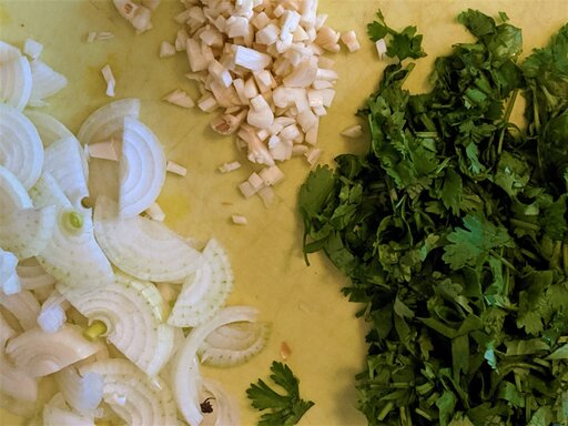 While the lentils cook, chop up some fresh coriander, garlic, and onions.