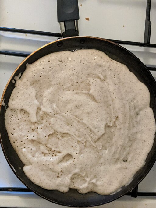 Fry until brown on one side, and then flip. Repeat this process until you have a nice, crispy, brown dosa (see the picture of the meal for reference). Serve hot and eat with the daal.