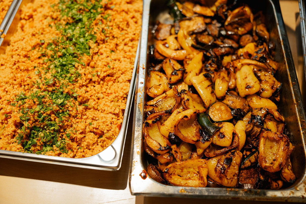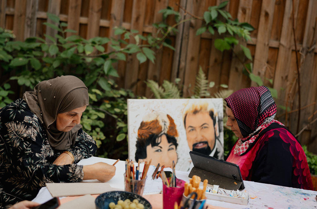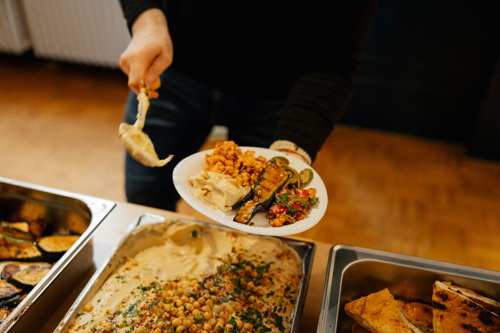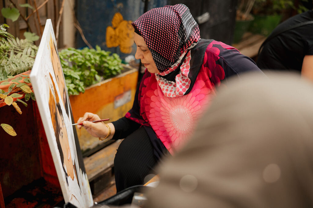 “We are cooking hummus!” Abdul was greeting me cheerfully. The middle-aged man with a contagious smile, a member of Open Kitchen, our social cooking project, was busy arranging plates and pitas on a long wooden bench. Three of his fellow Open Kitchen members were laying pieces of zucchini on the grill meticulously as if grilling veggies was an art—because for them it is. A few meters away, a dozen people, predominantly elderly women with headscarves, were painting silently with tempera in the corner, where GSBTB’s Open Art Space took place.