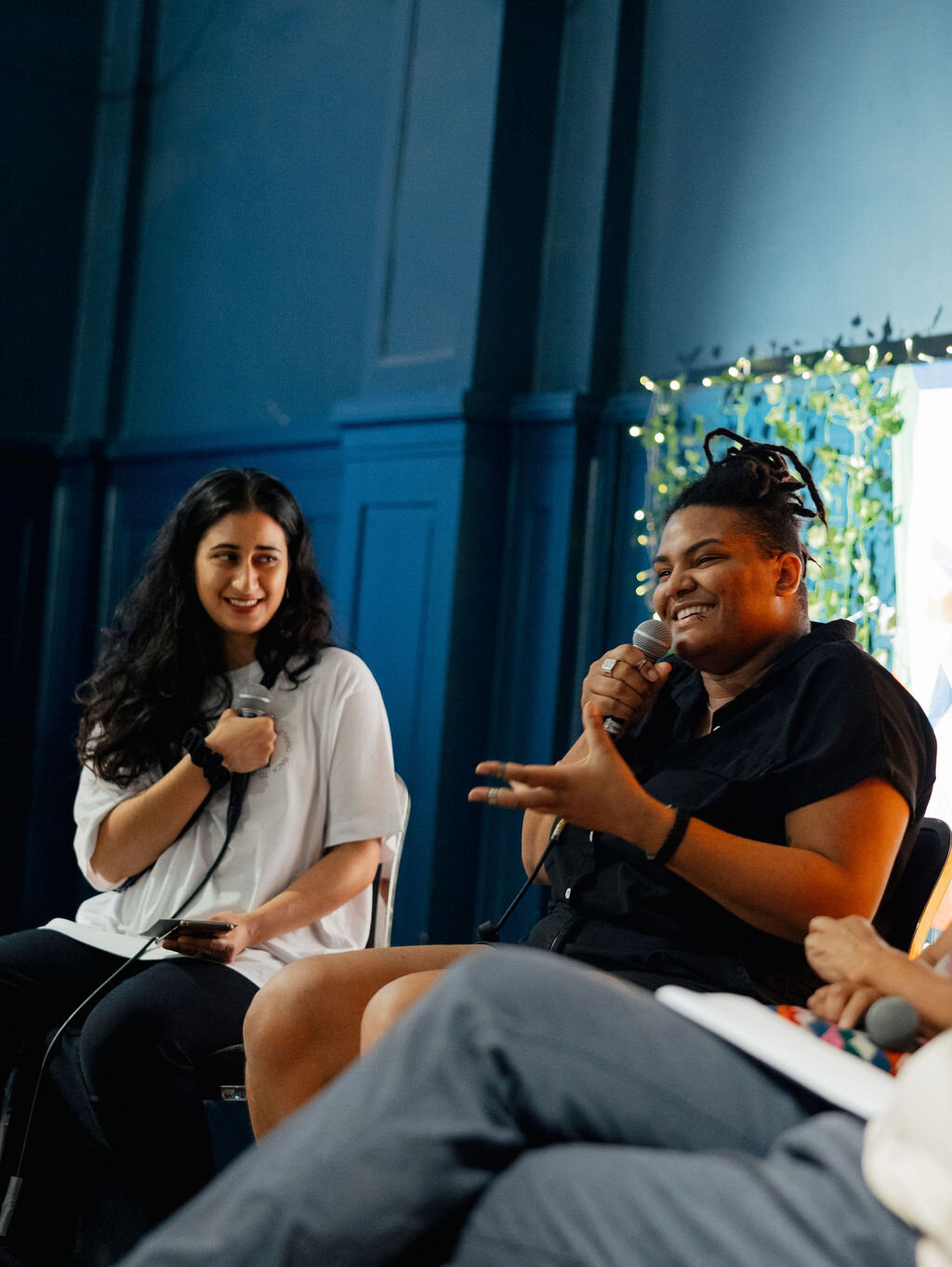 His speech was followed by a panel discussion about collective struggles and selective solidarity with representatives of migrant and refugee communities. Llanquiray Painemal (Legalisierung Jetzt! campaign and Mapuche activist), Koray Yilmaz (co-managing director of Migrationsrat Berlin e.V. and co-founder of GLADT e.V.), and Juliana Kolberg (project lead at xart splitta e.V.) talked about what solidarity means, with whom we show solidarity and its effects on the community.