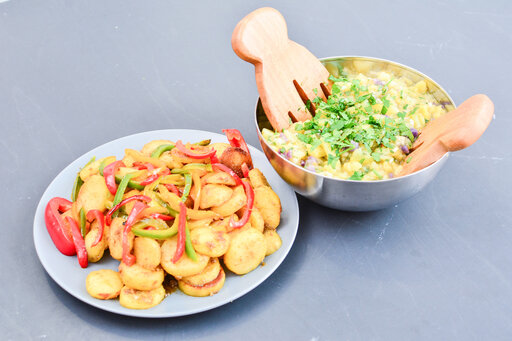 We are cooking two dishes with potatoes. I am preparing a classic German potato salad. It is a vegan dish using vegetable stock instead of beef bouillon. To provide visual relief I will add a few purple potatoes to go with it. Meanwhile, Anas’ potatoes are cooked with garlic and ground coriander. They will be cooked in oil, so a little bit like Syrian chips. This will also be served with fried peppers. Mhmmmm.