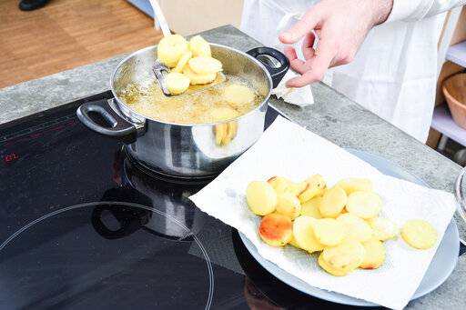 In the meantime cut the washed peppers and sauté in a pan with a little oil until they are ready to eat. Serve together with the potatoes.